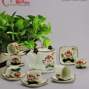 Bộ ấm chén men kem Tròn vẽ Hoa Sen và 4 Phụ kiện được sản xuất tại Bát Tràng với chất liệu gốm sứ cao cấp của Bát Tràng. Bộ ấm chén men kem được đốt trong lò với nhiệt độ 1300 độ C, nên các chất độc hại được khử hết đảm bảo sức khỏe cho người sử dụng. Màu men không phai, không ngả màu. Hoa văn trên sản phẩm, không bị trầy, không bị tróc, bền đẹp theo thời gian, khó bể mẻ khi va chạm.